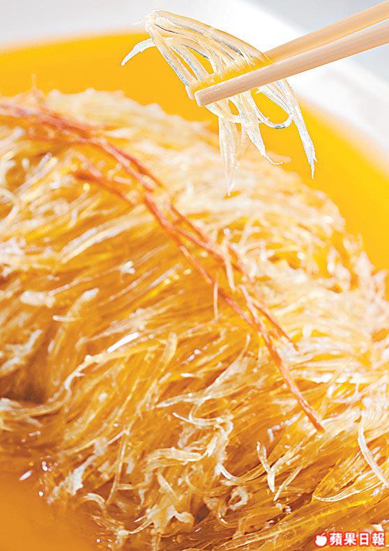 天九翅屬最頂級魚翅,而足12両的天九翅,翅身粗如芽菜,用上湯煨至入味,如食意粉般「啜」入口。