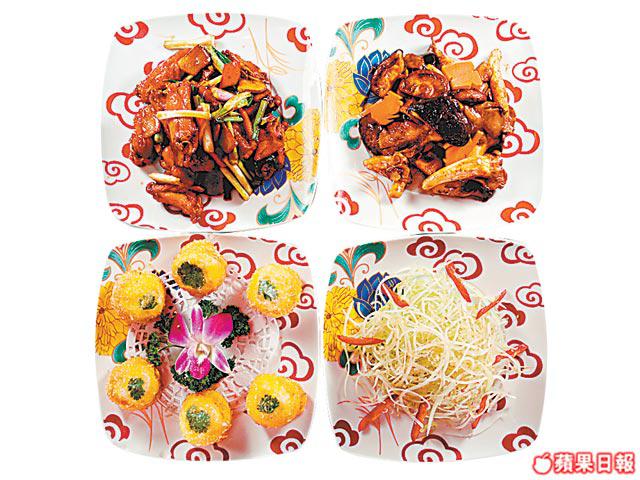 分別有酒燒鳳翼、紅燒珍菌、梨香玉子及芝麻芹絲等4道前菜。