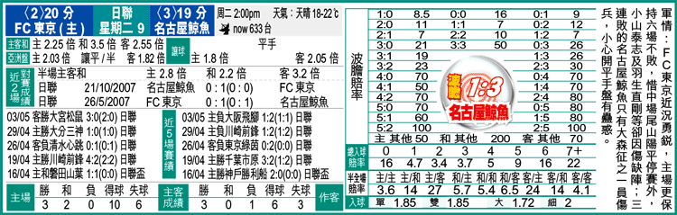名古屋鯨魚季初曾做出6連勝佳績,一度進佔榜首位置,直至近期才漸走下坡。事實上,這班波坐擁玉田圭司、科廸莊臣及小川佳純等好手壓陣,點計實力都在FC東京之上,今周亦僅得中場大森征之因傷缺陣。但從盤口看,鯨魚聯賽3連敗,對手則處佳態排次席,足智彩開平手盤?或是陷阱!