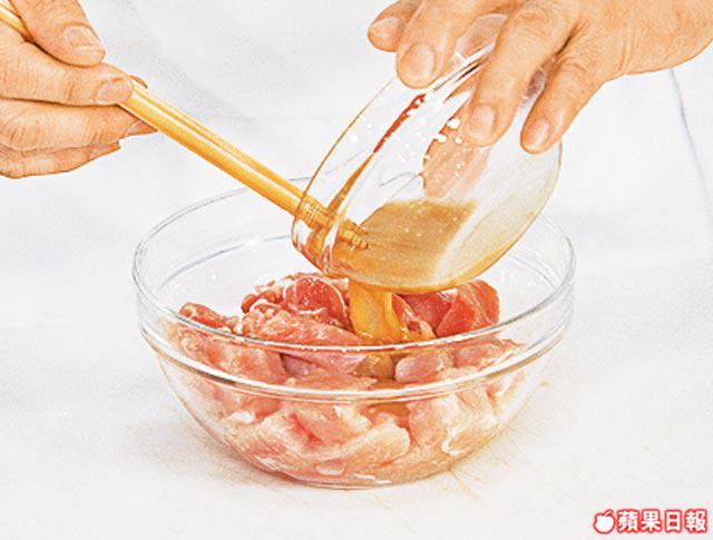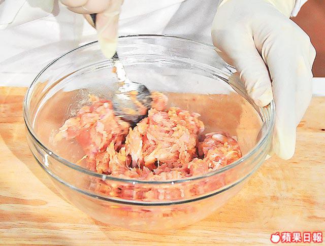 1.雞肉調味及洋葱粒加免治雞肉內攪至起膠。