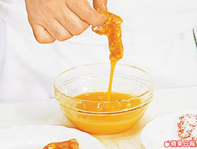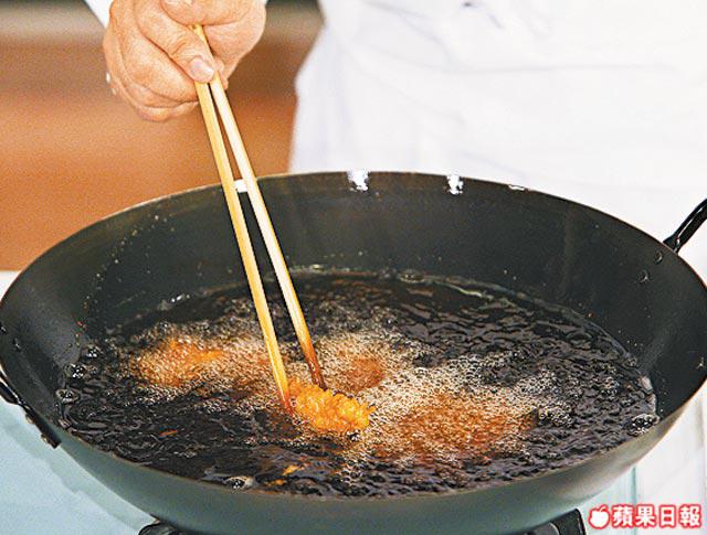 3.燒熱油至300℃,放入已沾麵包糠之豬肉眼,炸約4分鐘至金黃色及熟透,取出隔油即成。