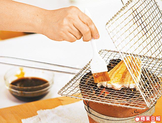 3.再將鰻魚放於炭爐,掃上燒汁作焙燒,重複數次。