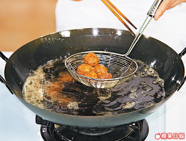 在炸雞肉丸子的過程不用將它炸至熟透,因之後再要將丸子燜熟,這樣烹調的雞肉丸子不會太熱氣,適合講求健康的朋友。