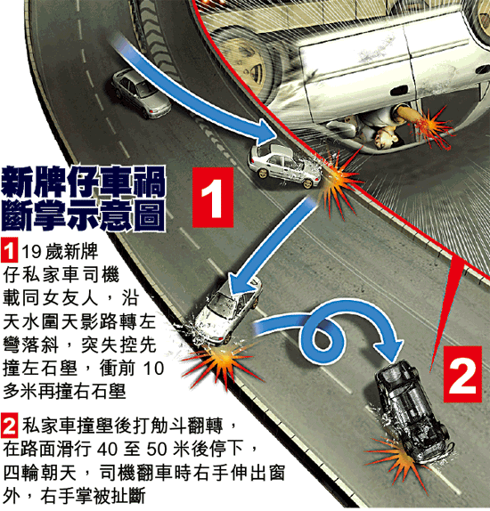 【本報訊】一名年僅19歲「新牌仔」司機,昨凌晨接載女友人「遊車河」,在天水圍掟彎落斜失控先後撞向左、右石壆再翻觔斗,全車四輪朝天滑行50米始停下。事主疑在車輛翻側時右手伸出窗外,整隻手掌被扯斷致血肉模糊,與車內女乘客被困車廂,由途經司機協助報警。兩人獲救後俱送院治理,肇事司機不斷問救護員:「我隻手仲駁唔駁得番?」
