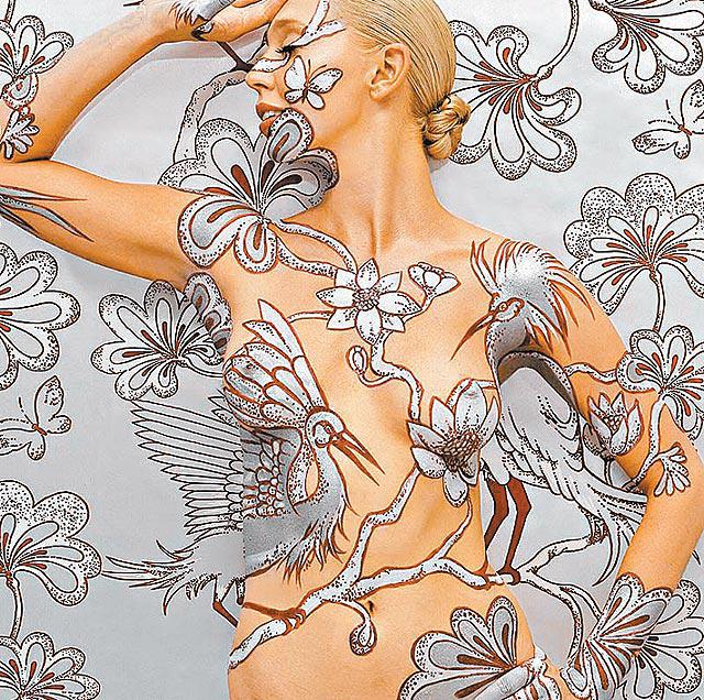 顏色調好了,模特兒站在牆壁前,哈克一筆一筆,將牆紙圖案摹畫在肉體上。要製作一幅完美無瑕、沒有「穿幫」的人肉牆紙,角度要精準,顏色要均勻。