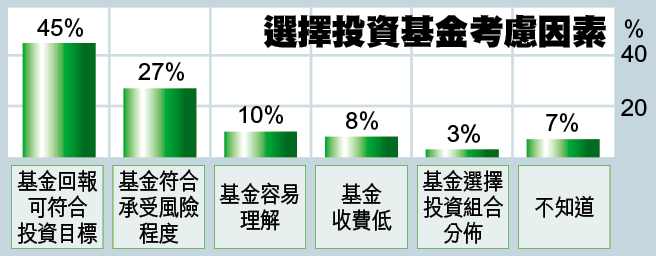 滙豐保險最近一項調查發現,強積金成員考慮選擇所投資的強積金基金,其中僅8%受訪者表示,會因為「低管理費」而選擇投資有關基金,相反45%認為,「基金回報可符合投資目標」是最重要考慮選擇的因素,反映僱員忽視管理費對其總投資回報的影響,情況值得關注。