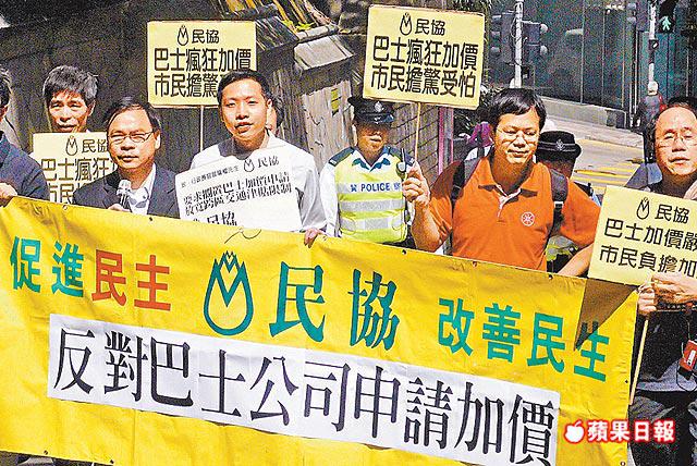 民協代表昨遊行至政府總部,要求政府擱置巴士公司加價,代表認為,各巴士公司申請的加幅高於可加可減機制計算到的幅度,一旦加價將令市民生活百上加斤。