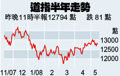 開市後兩小時(本港時間昨晚11時半),道指跌81點,報12794點;納斯達克綜合指數挫11點,報2476點。歐股方面,英國通脹為13個月來最高,降低英倫銀行減息可能性,英股在金融股領跌下於尾市挫0.23%,法股及德股分別升0.45%及0.26%。