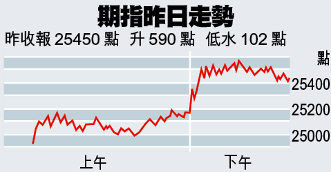 美股前晚漲130點,加上滙控(005)首季表現勝預期,抵銷四川地震帶來的心理影響,港股中段已反覆上揚約150點。午後港股突然亢奮,觸發點是一名機構投資者狂掃165張期指好倉,以每張合約按金12.75萬元計,涉及金額已逾2000萬元。大戶起動,刺激一眾觀望的散戶聞風追入,短短一分鐘內,即月期指突然抽高300點,至25500點,成交更誇張高達1304張。即月期指最終漲590點,報25450點,低水收窄至102點。