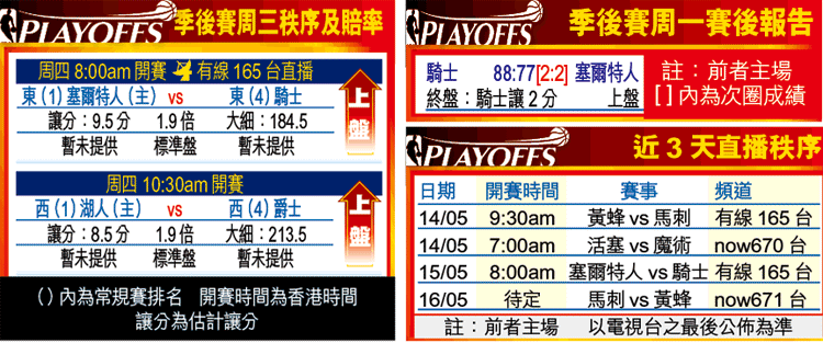 攻入21分的占士雖繼續手風欠順,全場只得20投7中,但交出13次助攻;加上在第4節於綠軍內線靈魂加尼特面前一記「in-your-face」入樽,將主場氣氛推至沸點,還有在內線有出色表現的華利奧貢獻12分和拉下6個籃板,卒以11分取勝,將總場數扳成2:2,更向「綠軍」贈上季後賽的第5場客途敗仗,成為今年季後賽迄今在客途未嘗一勝的球隊(見附表)。對於客途表現差劣,賽後只為「綠軍」取得15分的阿倫也無奈地說:「我也不知道可以怎樣解釋為何作客表現竟如此糟糕。」綜合美國外電