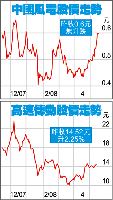 其他風電股昨亦有不俗表現,中國高速傳動(658)升2.25%,收報14.52元;香港建設(190)升2.37%,收1.73元。不少傳統電力設備股都有涉足風電項目,當中哈爾濱動力(1133)和上海電氣(2727),昨分別升5.35%和0.91%,收報15.36元和4.42元。