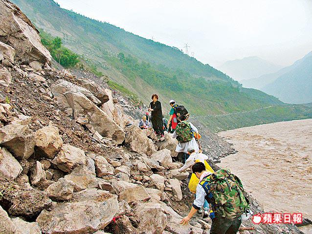 災後第三天,從政府人員口中得知,映秀鎮災情最嚴重。我僱用汽車,設法進入那裏,但所有來往映秀鎮的道路都被山泥與巨石砸毀了。我只得徒步攀山,前往58公里外、災民口中的這座孤城。出發不久,就碰見一對從映秀鎮逃出來的兄弟,二人合力扛着父親,走了十多小時路:「許多人都離開了,害怕瘟疫爆發。」
