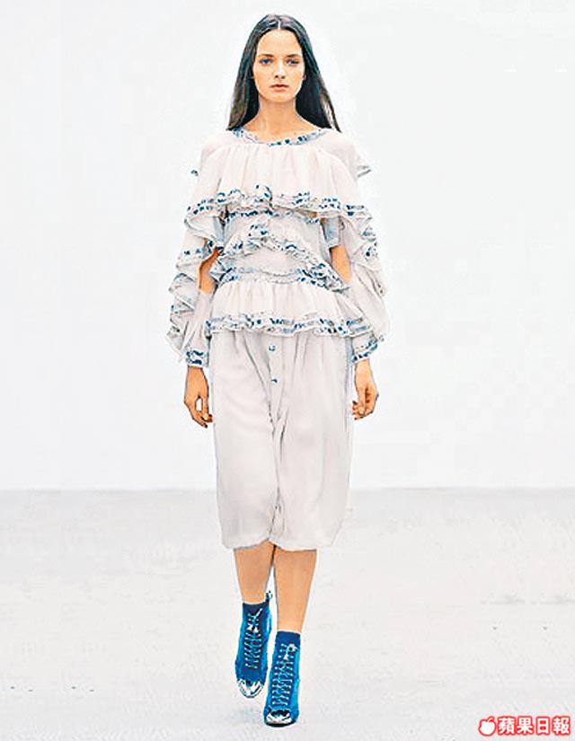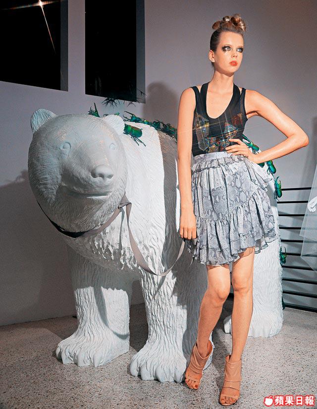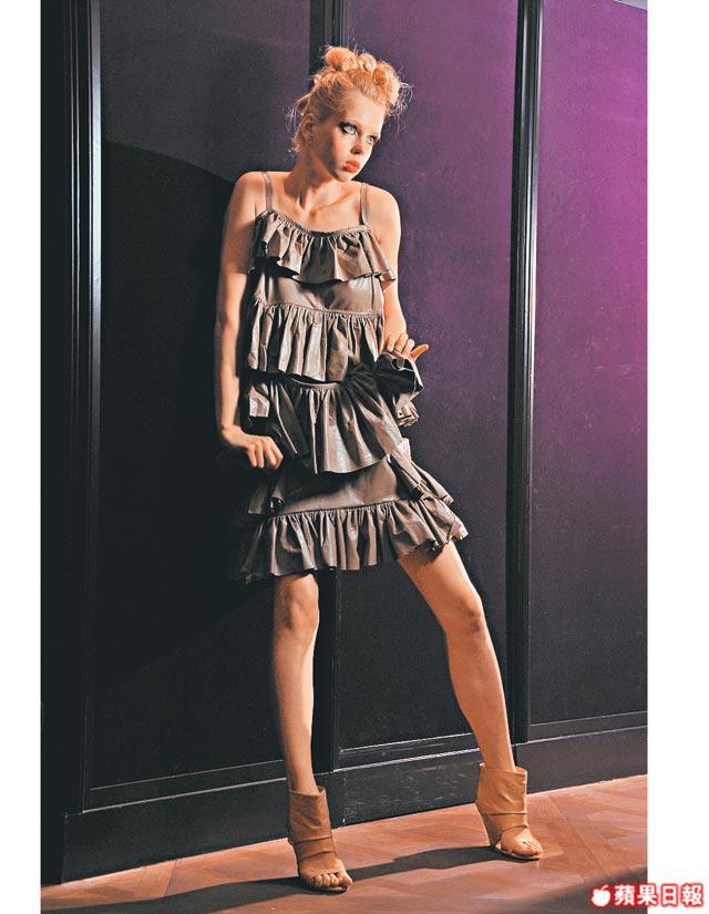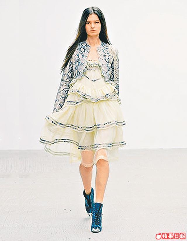 小時候小記看驚慄電影,常搞到噩夢連連。原來每個小孩都有類似的成長片段,ChristopherKane和他姐姐Tammy一同在沙發上看驚慄片《Carrie》和《鱷魚先生》的童年記憶,觸發了他今季的設計主題,更索性以家姐Tammy做muse,設計出一系列恍如被鱷魚咬噬後的ruffles、蛇紋小背心、怪款雪紡紗裙和透氣ruffle皮裙,處處表現出怪異美,且都帶有ChristopherKane特有不太矯揉造作的女性嫵媚。