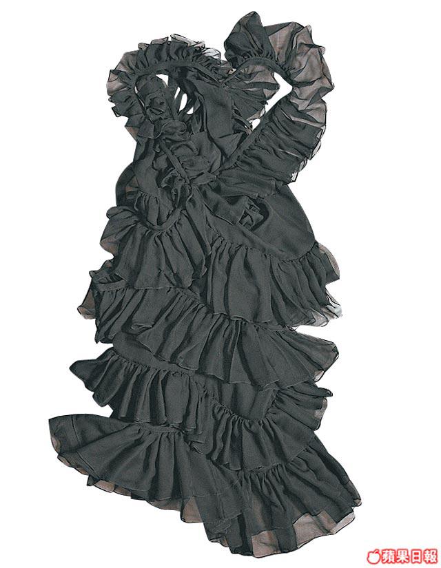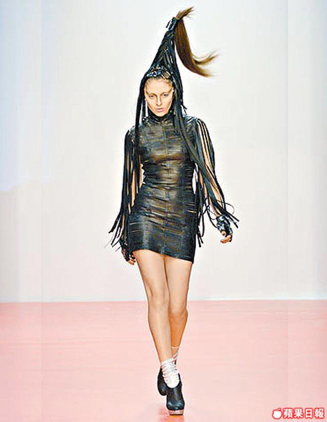 GarethPugh對黑白的鍾愛程度,連帶所有作品全是清一色黑白。他今季的怪誕設計,靈感源自85年一部科幻電影《Legend》,Gareth把劇中PrincessLili的陰暗面延續,設計了一系列結合公主高貴和暗黑神秘的服飾,粗身皮條子ribbonleatherdress如盔甲般包着身體、黑色水晶one-piece、束帶ribbon皮裙等,Gareth以他最擅長的costume功架,把各種布料以立體形態呈現,正如他本人的形容"Aboutthestrugglebetweenlightnessanddarkness",散發出懾人的神秘魅力。