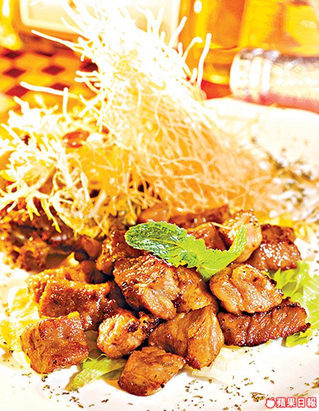 西芹、洋葱、甘笋及啤酒攪爛醃德州牛柳粒,甘香嫩滑。