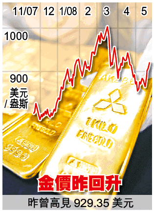 黃金發揮對冲通脹作用,現貨金曾漲10.1美元或1.1%,見每盎斯929.35美元,為一個月來最高。