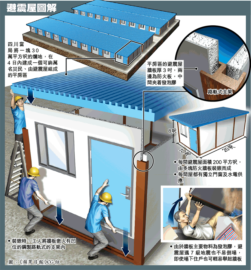 至於接到住房和城鄉建設部供應活動板房指標的20個省市,按經濟實力分作兩批,第一批須各建六萬套,包括北京、上海、天津、廣東、江蘇、浙江、河北、山東、湖北、河南等10個地方;第二批則只須建四萬套,包括重慶、安徽、湖南、江西、遼寧、福建、山西、陝西、雲南、貴州等10個地方。這些省市須於7月10日、8月10日及9月10日分別交出25萬間、35萬間及40萬間活動板房。