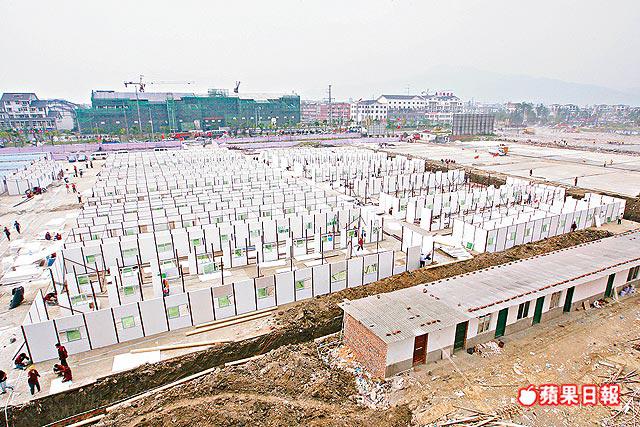 這些來自上海和重慶的預製牆板用料十分輕,三吋厚的牆板兩邊是防火板,中間夾着的是發泡膠,工人可以輕易的用人手將牆板嵌成單位的牆壁,向街位置安裝有窗門和大門,完成後便成了一列列每列10個單位的平房。