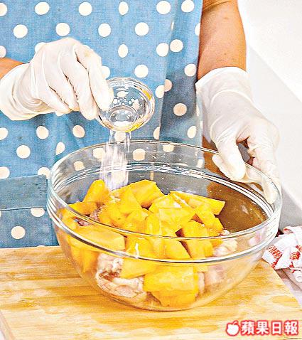 3.菠蘿及雞肉撒上鹽略醃。