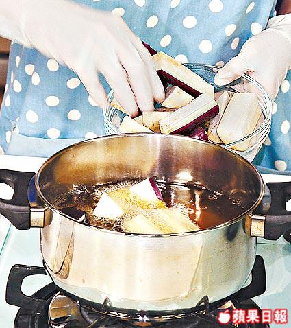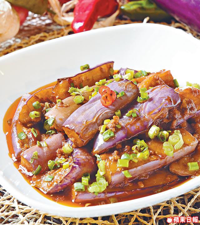 1.茄子切條,用熱油炸至軟身盛起。