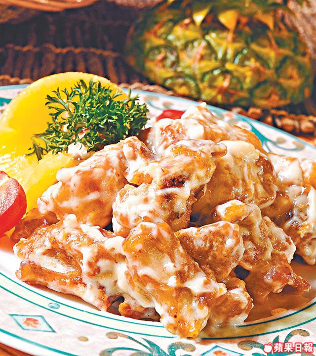 3.汁料拌勻煮熱,落腩排拌勻熄火,最後加菠蘿拌勻上碟。