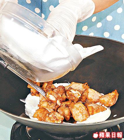 答:首先汁料材料完全拌勻,然後將腩排用油炸過,並用廚房紙將油索亁,將兩者落鑊兜炒便會較均勻。