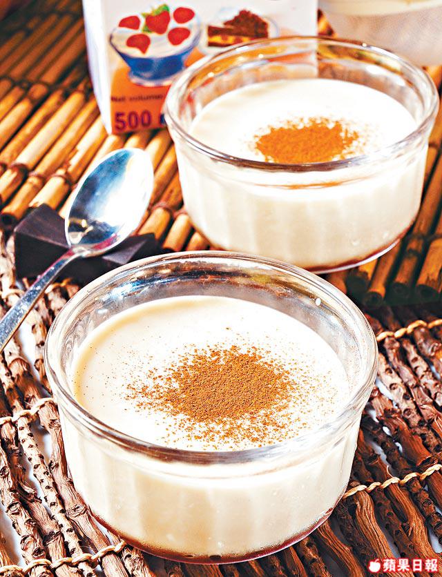 2.預備4個小杯,每個放入1茶匙焦糖,再平均倒入(1),放入雪櫃雪至凝固,最後灑上肉桂粉便成。