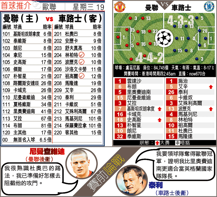 此外,決賽地點被安排在莫斯科的盧茲基尼球場舉行,據悉球場草地本身已欠佳,且天氣預測當日會下雨,令場地環境更加惡劣。不過,車仔一向踢慣「薯仔田」,記得05/06球季歐聯16強首回合,便有傳他們刻意不將史丹福橋球場草地重鋪,而使用「爛地戰術」迎戰巴塞隆拿。反觀曼聯擅打地面戰,亦沒有像車仔擁有杜奧巴這類柱躉式中鋒,場上發揮應難像英超時般暢順。