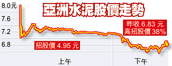 周一暗盤價升26%的亞泥,甫開市便升至全日高位8元,較招股價升逾60%;惟升幅迅速收窄,上午收市前徘徊7元以上,午後開市即跌穿7元,最後收報6.83元,全日總成交約13.71億元。