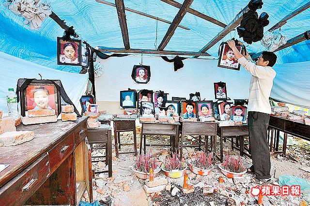 昨日下午2時半,百多名慘死學生的父母和家人相約返回學校現場,在通往倒塌大樓的路上築起祭帳,並用多張學校書枱排列成祭壇,上面擺放着一張張死去學生的遺照。祭帳拉開,是一張寫上「沉痛悼念寃死的孩子們」布條,地上除了燃點着多支香燭和放着幾個香爐外,並堆滿了百多個書包,那都是和死者一塊兒從瓦礫中挖出來的。