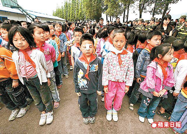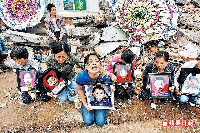 災場變了靈堂,書包當作鮮花,祭帳是:「沉痛悼念寃死的孩子們」,祭文是:「天災不可違人為最可恨」。四川綿竹縣富新鎮一間小學上周一發生大地震時,整幢三層高的教學大樓完全倒塌,壓死壓傷300多名學生,然而大樓周圍其他樓房屹立不倒。慘死學生的父母指摘鎮政府19年前興建校舍時偷工減料,令孩子們無辜枉死。百多名家長昨日懷着悲痛的心情,捧着子女的遺照到災場公祭,他們「不怨天只尤人」。