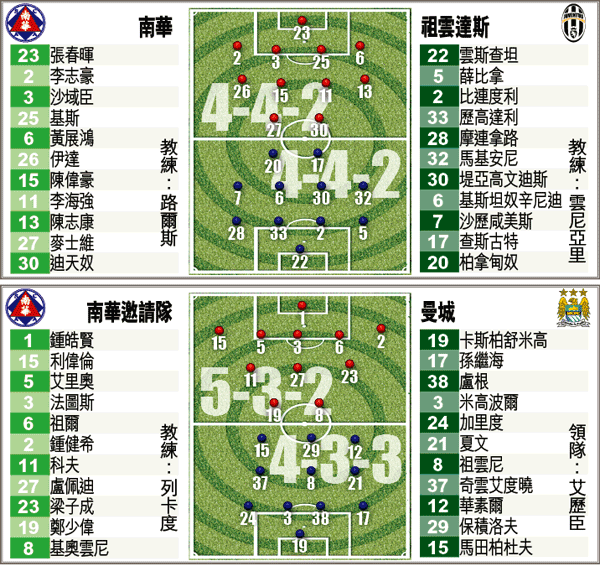 廸比亞路及尼維特甩底,祖雲達斯只餘查斯古特一人孭飛。南華足主羅傑承不滿「斑馬兵團」貨不對辦,決定在「時富10周年英超意甲足球日」重賞少林兵打真功夫,誓要讓半力出擊兼受時差影響的意甲代表吃盡苦頭。(now633台今日8:30pm直播)