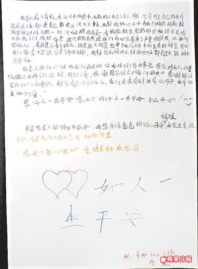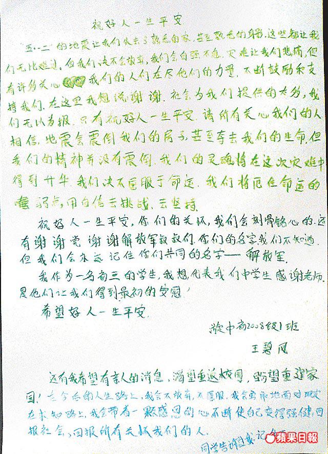 「祝好人一生平安。『五一二』的地震讓我們失去了熟悉的家,甚至熟悉的身影,這些都讓我們無比難過。但我們決不會放棄,我們會自強不息,災難讓我們悲痛,但有許多關心我們的人們在盡他們的力量,不斷鼓勵和支持我們,在這裏我想說:謝謝!……我希望有親人的消息,渴望重返校園,盼望重建家園!在今後的人生路上,我會不放棄,不屈服,我們勇敢地面對現實,在求知路上,我會帶着一顆感恩的心不斷使自己變得強健,回報社會,回報所有關懷我們的人。同學告訴過我,記住要(笑)。」