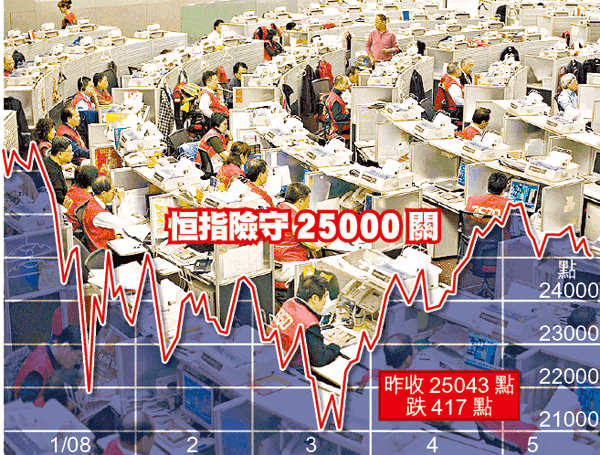 【本報訊】油魔肆虐及憂慮美國出現滯脹風險,港股昨日曾跟隨外圍急跌759點,收市跌幅收窄,險守二萬五,挫417點或1.64%,收報25043點。業界指出,恒指下一支持將退至250天線約24700附近;而近年睇市奇準的瑞銀策略員陸東更不客氣預計,港股現水平偏高,短期內會拾級而下,跌至二萬點才值得入市。 記者:黃武榮、丹琍