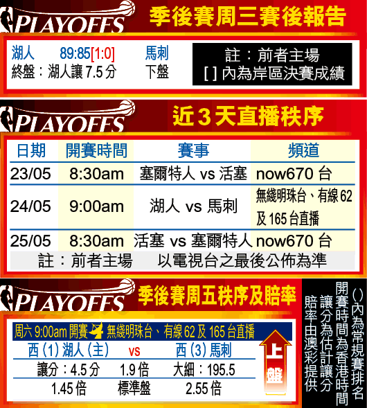 主場落後20分?冇問題,只要有MVP拜恩在陣就得!在周三舉行的西岸決賽首戰,湖人在主場一度落後馬刺20分,但憑下半場密不透風的防守;加上拜恩全場攻入27分和9次助攻,成功帶領球隊「逆轉勝」89:85。士氣大振的湖人,將於周五主場再次迎戰馬刺(無綫明珠台、有線62及165台明日9:00am直播),相信有力再下一城。文:仙道彬