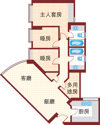 放盤單位面積1,165方呎,採原則3房2廳間隔,連1套房。甫進屋內全屋裝修簇新,配襯一系列啡色家具,視覺效果和諧自然,大廳呈長形,設有落地玻璃,可望清靜內園泳池景,景致豐富。飯廳牆身改用鏡面代替,有助擴大室內空間感,配合特色水晶吊燈,可增添貴氣。此外,廚房空間之大,足以放下U形大廚櫃組合,儲物量充足,切合愛好下廚一族的需求,同時屋內設有工人房,或改作儲物房使用。