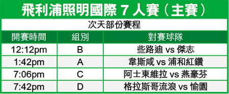 至於戲肉主賽今午展開;衞冕的維拉被編在C組,同組有燕豪芬、寶路華流浪及友聯隊,其中維拉對燕豪芬是分組賽最矚目賽事。事實上,維拉前鋒廸方尼素已被提升上甲隊,而燕豪芬青年軍實力向來不弱,只是不擅踢7人賽。