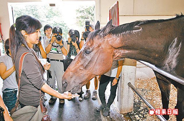 奧運馬術公司為使新聞界更了解此項運動,昨日在屯門騎術學校舉行「奧運馬術工作坊」,傳媒除可親身接觸馬匹外,還有專家介紹馬術;圖為一位女記者以紅蘿蔔餵飼前馬王「靚蝦王」。王子俊攝