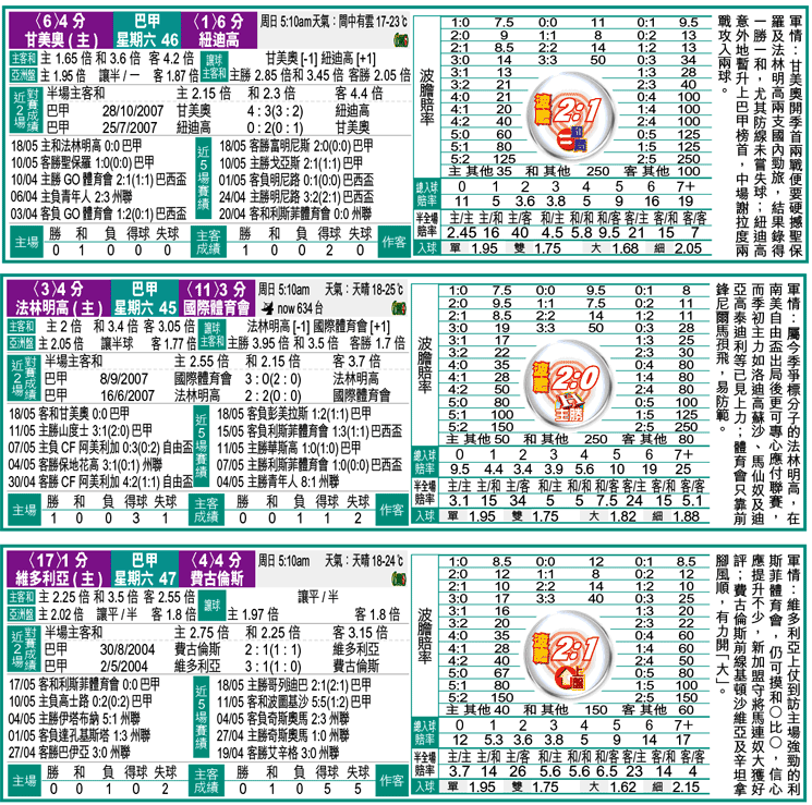 至於從巴甲精華所看,主隊前線洛廸高蘇沙、廸亞高泰廸利及馬仙奴等默契不俗,可續投信心一票。國體會聯賽連同巴西盃及州聯錦標在內,作客已4連敗,主力射手尼爾馬仍未開齋,難靠。