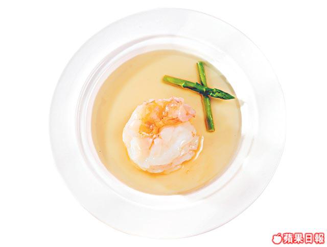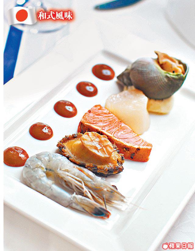 帶點日本風味的頭盤,醬汁由魚湯、青芥、日本醬油等打成。推介中間的慢煮三文魚,熟而不亁,入口即融。