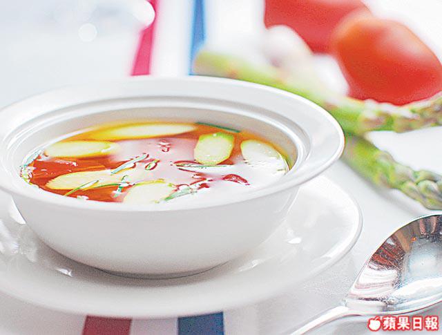驟看以為清淡無味,原來用很多番茄去煲,番茄味濃,還甜中帶酸;加上爽口蘆笋,開胃一流。