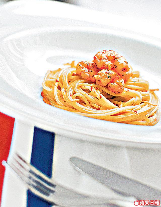 是用蝦頭熬出來的蝦汁煮意粉,只加入蒜片、橄欖油等,最後灑上少許辣椒碎,微辣惹味。