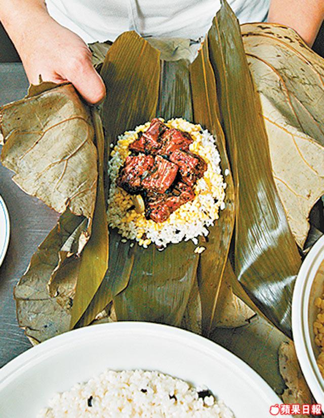 今年洲際酒店中菜廳欣圖軒,首創黑菌和牛裹蒸糭,每個$688/a,由主廚劉師傅設計。原來酒店6月份引入日本宮崎縣「綾」A5級和牛做推廣,在THESTEAKHOUSEwinebar+grill,每客12安士以近$2,000發售。今次就以這種頂級牛扒切厚粒做糭,每隻含約2両(約3安士)牛肉,再以日本白梅糯米配合炮製。師傅先用富士山火山地帶600米深的地下Fine天然井水(酸鹼值達7.8)浸糯米2小時以引發米香,所含天然礦物質及微量元素有益健康。