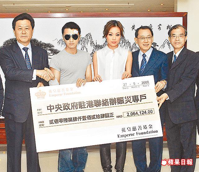 容祖兒、謝霆鋒昨日陪同老闆楊受成到上環中聯辦,將英皇集團捐出2,064,124港元善款支票交予中聯辦副主任李剛手中,善款稍後轉交中國紅十字會,該筆善款是集團上下員工(不包括藝人)籌集的,祖兒稍後再捐10萬,累積捐出20萬,霆鋒前後共捐30萬。