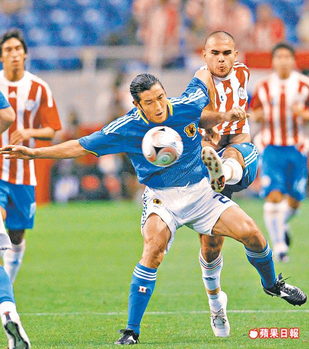 日本後衞寺田周平(左)力阻巴拉圭前鋒保加度射門,最終雙方互無紀錄;日本以1勝1和成為麒麟盃冠軍。路透社