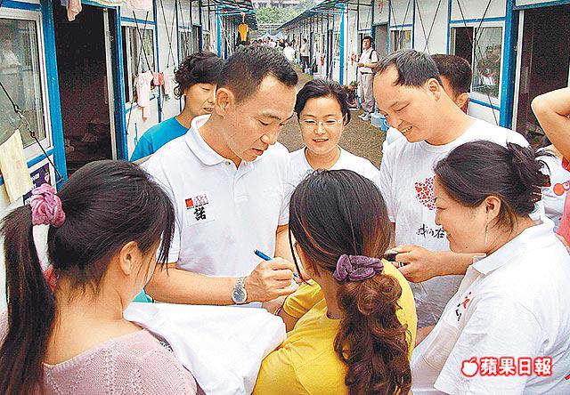 林保怡、陳芷菁與姚子羚昨日則離開大隊,約2時許被安排到青羊體育場作探訪,災民被安置在板間房內,由於天氣太熱,不少災民都走出來乘凉,當災民看見有香港明星到來時都表現得很興奮,特別是保怡就更受災民歡迎,他接受訪問時,指內地政府對災區的協助做得好好。
