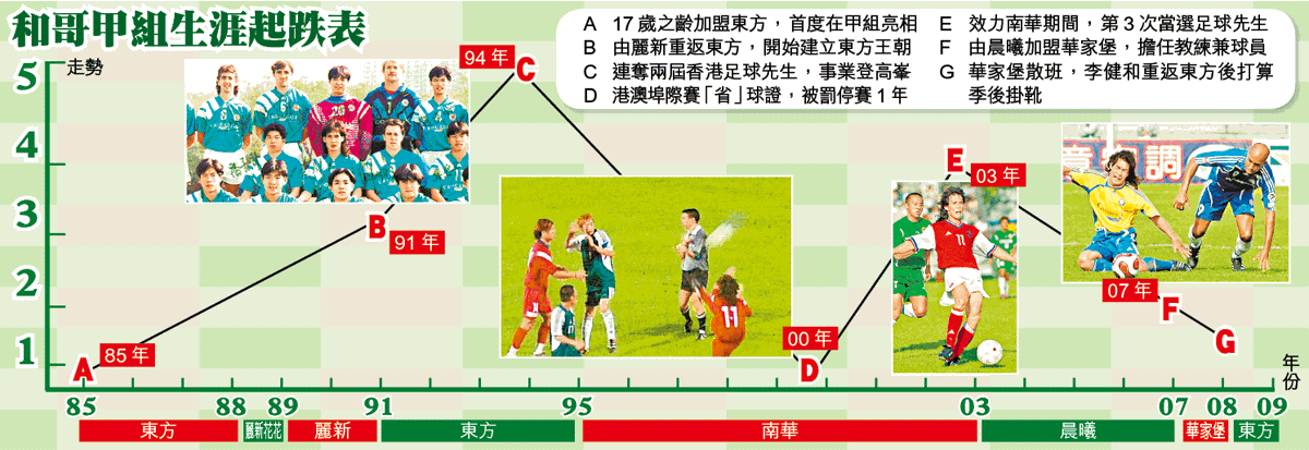 17歲出道的李健和在85年加盟東方,其後轉投麗新花花及麗新,但要數事業高峯,便是91年後重返東方,與譚拔士及基亞等外援合組的東方王朝,而「和哥」更於93至95年度兩個球季,贏得兩屆香港足球先生榮譽。「和哥」95年轉投南華後仍獲獎無數,直至03年加盟晨曦前夕,他以南華球員身份,第3度奪得足球先生獎項,成就僅次於4度當選的胡國雄。