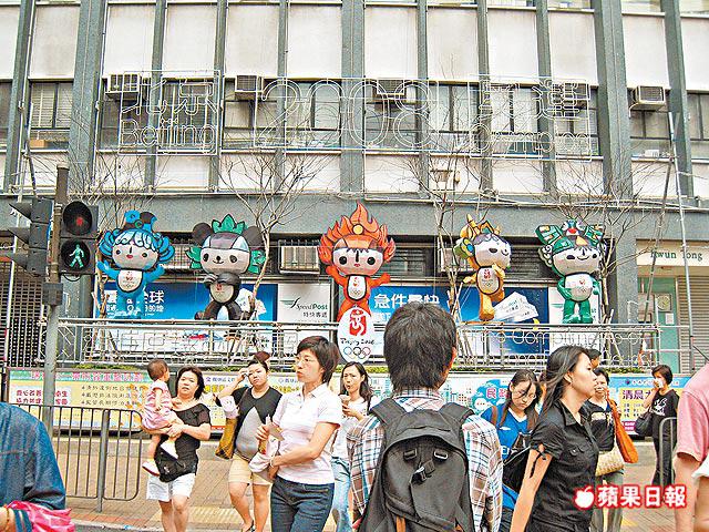 觀塘區這排福娃,白天看似無甚吸引,但到了晚上,不單福娃們身上的燈會亮,連上方的2008字樣也會亮,晚晚像元宵一樣熱鬧。徐嘉華攝