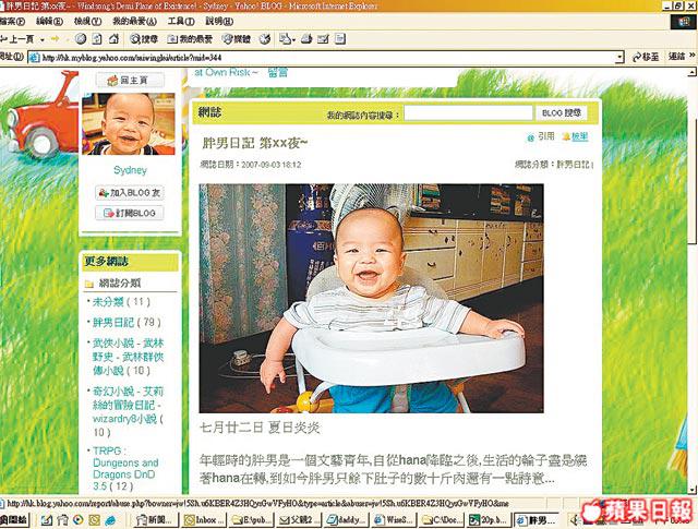 因從事網頁工作,以家為homeoffice的Sydney在兒子Ian出世後2個月,發覺菲傭對兒子照顧不周,於是自己便親自照料,從此擔當「湊仔」的責任,直到現在快1年。「當時太太身體仍未康復,腰部經常疼痛,而我又在家工作,所以便負責看管囝囝。」外表雄赳赳的Sydney,一談起兒子便面帶微笑:「Ian學行後會常常爬上凳,再走上工作枱亂按電腦鍵盤,所以現在每當我離開座位時,也要將凳拿走。」Ian的「搗亂」不但沒令Sydney發怒,反而把這些瑣事記載於網誌內。「看着他每一刻也在改變、成長,感覺很特別,有時想若自己不在他身邊,可能會錯失這些重要時刻。」