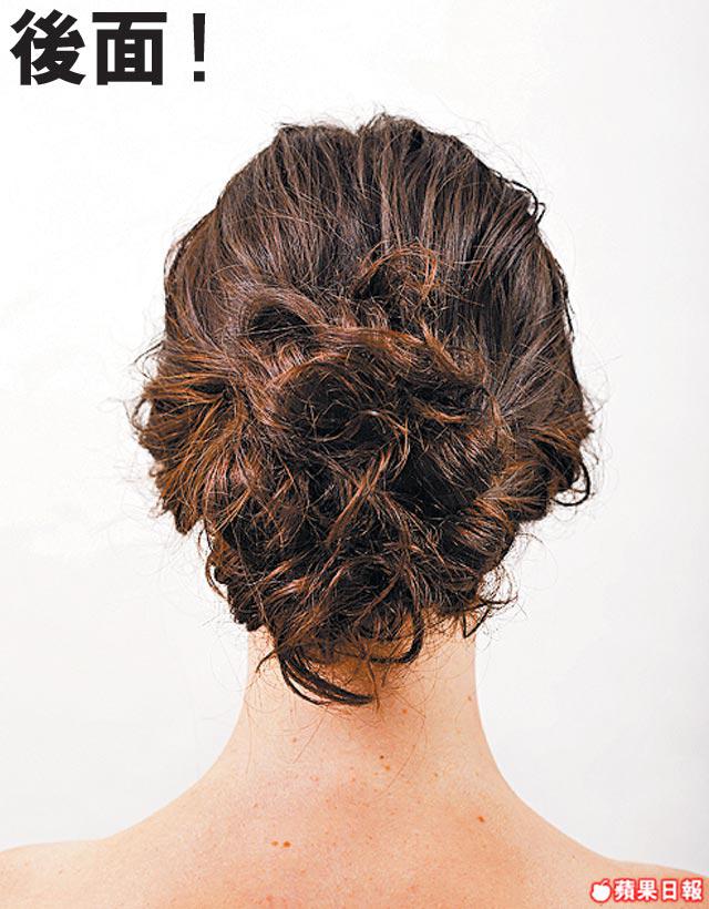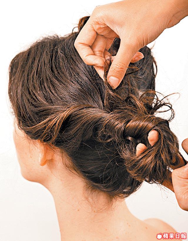 3.至於上半部份,拿起髮尾向外扭,形成髮髻,並輕輕向前推,用髮夾定位。